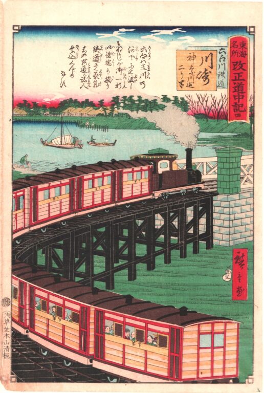 三代歌川広重《東海道名所改正道 中記六郷川鉄道 川崎 神奈川迄ニ り半》1875年 郵政博物館蔵 ※7/16~7/31 展示